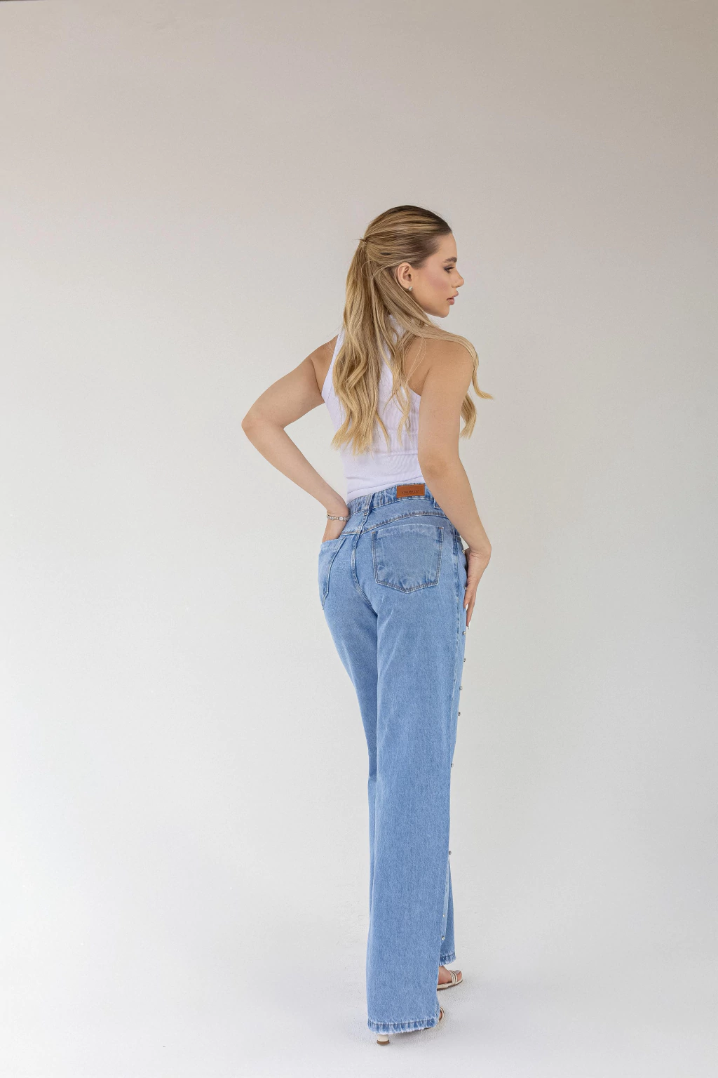 Renove seu guarda-roupa com a Calça Jeans Wide Leg com Aplicação de Pedraria Cami e sinta-se única em qualquer ocasião!