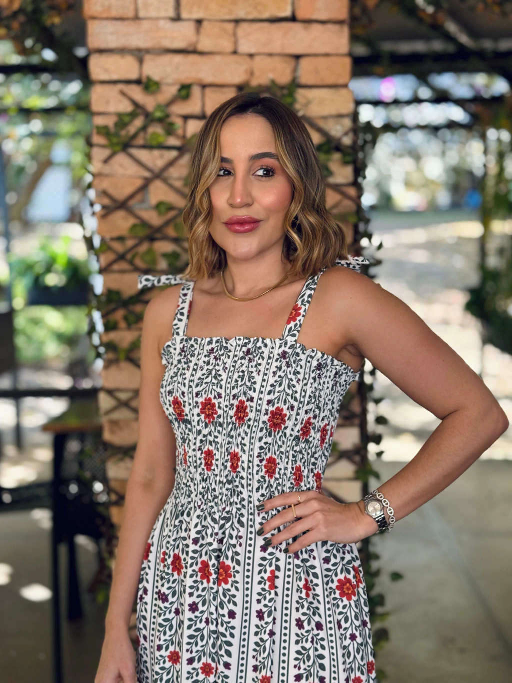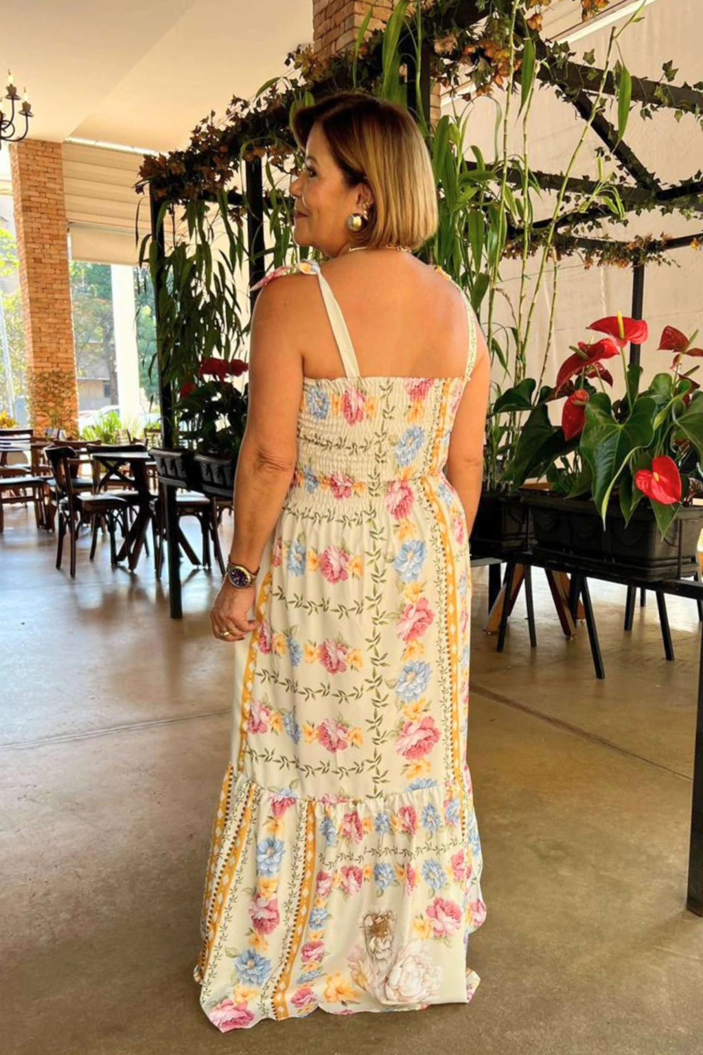 💙 A cor off com rosas vermelhas traz sofisticação e serenidade ao look, sendo fácil de combinar com sandálias, rasteiras ou saltos.
